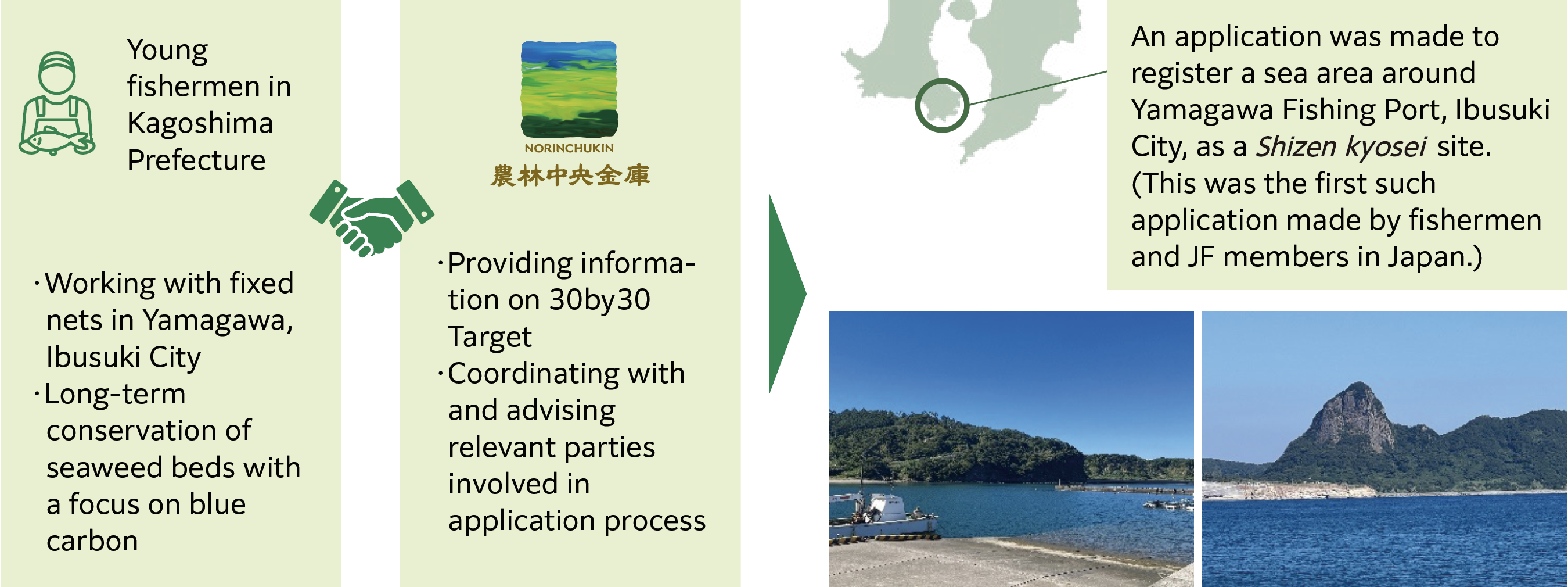 However, there remains a gap in Japan between the percentage area actually under managed conservation and the target of 30%. As of 2021, there was also a difference between the conserved land and sea areas, with only 13.3% of sea areas being conserved compared with 20.5% of land areas. That boundaries and ownership are not as clear offshore as onshore may be a factor here. But that said, there are sea areas where fishermen and JF members carrying out both ecosystem conservation and commercial fishing are also playing a central role in creating blue carbon ecosystems, and we recognize these areas are extremely important for achieving the 30by30 target offshore. In a move toward bringing about nature-positive activities in sea areas, the Bank is promoting Shizen kyosei sites in cooperation with motivated JF members and others. Shizen kyosei sites are areas designated by private initiative, etc., for preserving biodiversity.
