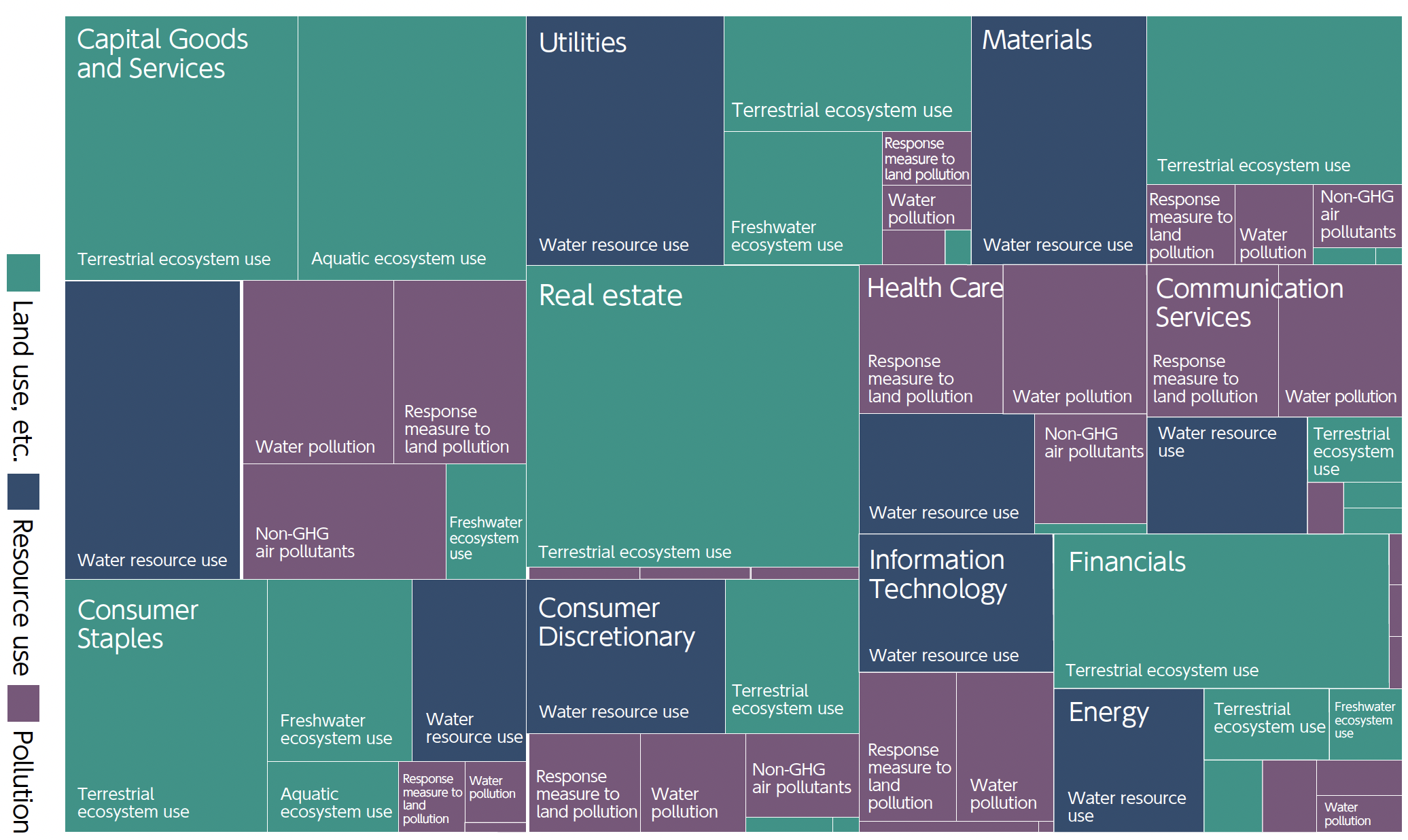 The Bank ascertained four dependencies categories to understand overall dependencies on nature in our portfolios. These categories include land (e.g., soil quality and land stability), climate (e.g., climate regulation and pollution mitigation through the atmosphere), water (including groundwater, surface water, and oceans), and biodiversity (e.g., plant and animal habitats and pollination). (This analysis does not take into account the value chains of our investees and borrowers.)