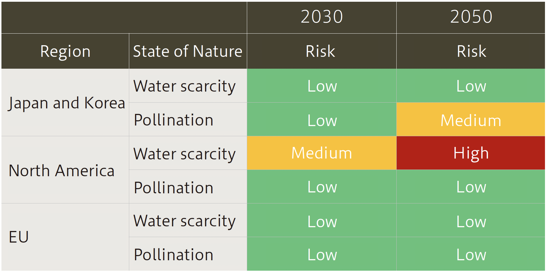 The Bank conducted a trial analysis on qualitative scenarios related to nature using FPS+Nature, an integrated nature and climate scenario for investors. We summarized transition risks predicted through the analysis and evaluated the degree of physical risks assumed under the transition scenarios provided by FPS+Nature Physical risks were evaluated by region and over the medium- to long-term for parameters related to water scarcity and pollination, issues closely linked to the food and agriculture sectors. The results of this assessment confirmed the Bank faces potential additional costs associated with freshwater use and the risk of shutdowns due to water withdrawal restrictions, particularly in North America.