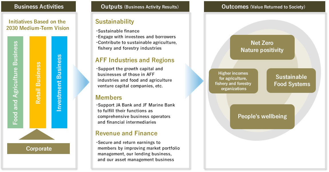 Based on our medium-term vision, the food and agriculture, retail, and investment divisions work toward achieving our purpose and resolving material issues. Together, these divisions work to achieve appropriate economic returns through investments, loans, and engagements (supporting a wide range of businesses including consultation and providing solutions). At the same time, divisions support investee, borrower, and stakeholder efforts to reduce negative environmental and social impacts while generating positive impacts.