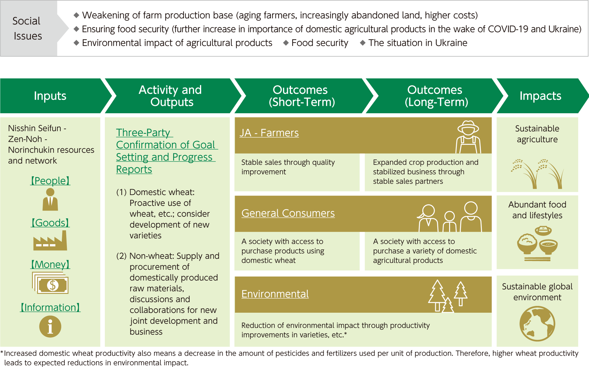 National Federation of Agricultural Cooperative Associations ("Zen-Noh") and The Norinchukin Bank entered into a capital alliance with Nisshin Seifun Group Inc. headquarters ("Nisshin Seifun"), acquiring common stock equivalent to approximately 1% of the Nisshin Seifun outstanding total (published November 17, 2020). Japan's agriculture sector is dealing with environmental and social issues that include such a shortage of farmers. Japan has a particularly low self-sufficiency rate for wheat, and the government is pushing a shift in cultivation to wheat from rice, increasing the cultivated area and production volume. A further issue is how to grow demand in line with this increase in production. Recognizing these issues, Zen-Noh and the Bank invested in Nisshin Seifun, which is the industry leader at 40% of the domestic flour market. The objective of this investment is to encourage production and expand demand for domestically produced wheat. The three parties discussed and established common goals related to this investment. We receive regular progress reports and have confirmed that efforts are having a gradual effect on encouraging domestic wheat products and increasing demand. According to Nisshin Seifun, the company has entered into joint development to secure a stable supply of domestic wheat and other domestic agricultural and livestock products, while extending its product lineup. Zen-Noh indicated that the organization is developing production and variety development based on demand with input from Nisshin Seifun. The Bank will continue to provide support for funds and smooth communications, encouraging the three-way efforts to resolve issues throughout the value chain.