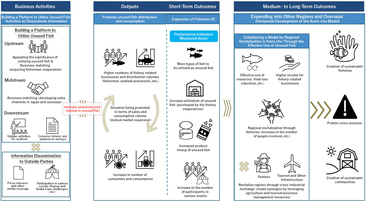 Unused fish is a general term for fish that have good flavor but are passed off as inedible or valued only at low prices for being non-standard, caught in small quantities, not being well known, or other such reasons. The Osaka Branch of the Bank works with the town of Kami-cho in Hyogo Prefecture, JF Tajima, and other organizations of the partnership to establish a new fishery value chain for utilizing unused fish. We recognize that portions of catches are discarded at sea and the potential market for unused fish and that the economic benefits of the sustainable utilization of unused fish are not quantified in terms of business. In response to these issues, we conducted an impact assessment to identify environmental and social outcomes, identify pathways to achieve such outcomes, and create new markets.